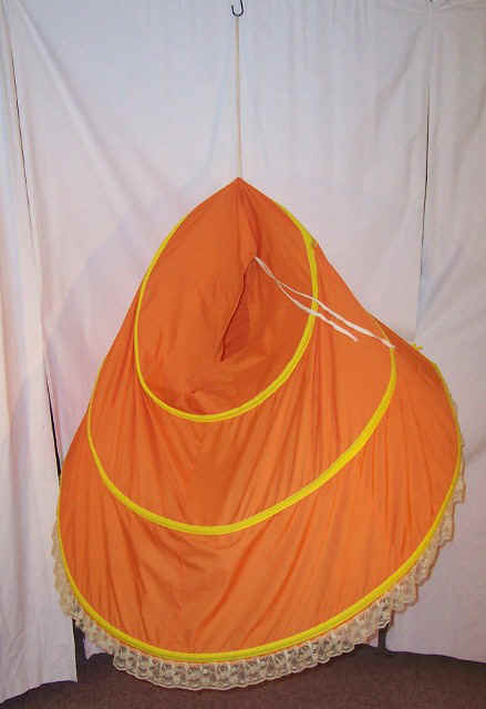 Hoop Info Drawstring ties around the waist. Three flat, springy, metal hoops keep the shape. The hoops will flex as you pass